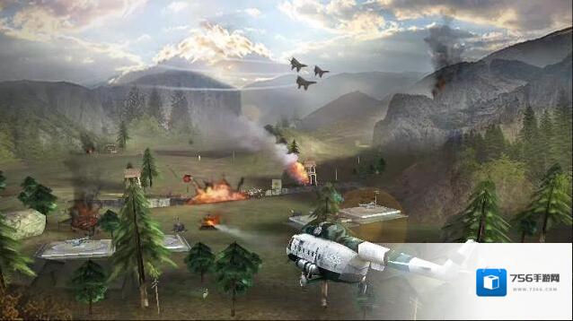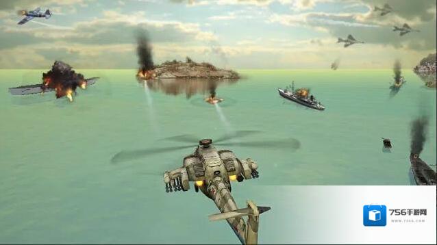 3、战斗场景,操控直升机,在陆海空战场,射击敌方战机、摧毁地面目标,完成消灭敌人任务,展现空战玩法,画面有爆炸、战机缠斗特效。