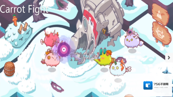 1、在Carrot-Fight首场景,点击箭头指向的紫色角色,触发互动(战斗/任务),推进游戏。