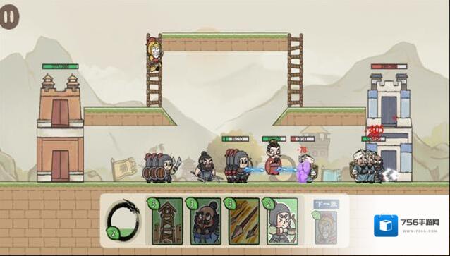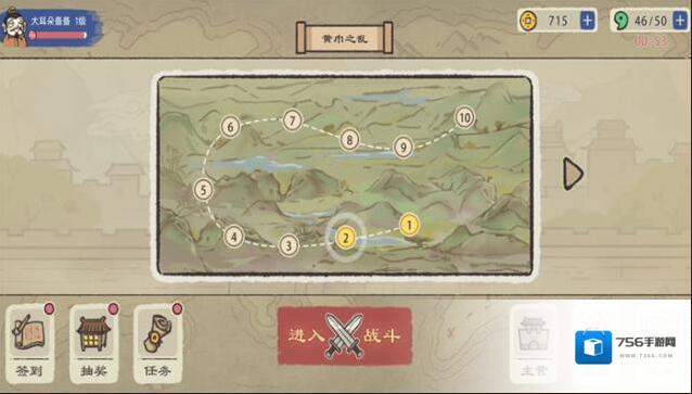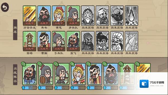 2、在牌库选武将,编排出战阵容,进入关卡,操控角色策略战斗。