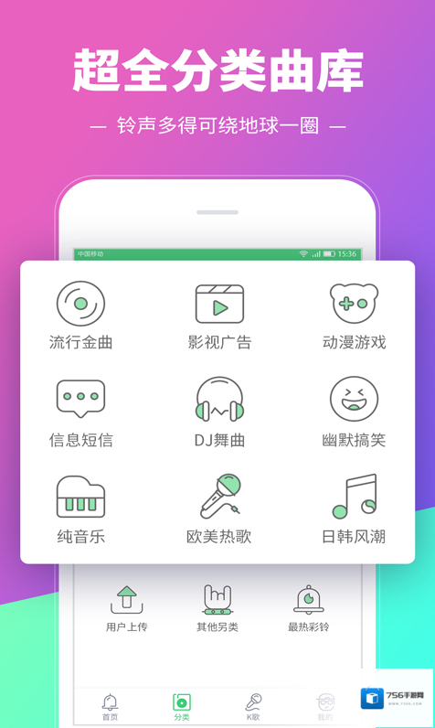 2、精细铃声分类,经典、原创、翻唱、恶搞、影视、动漫选你喜欢。