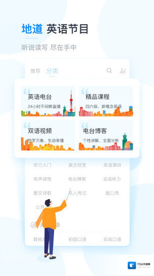 2、它的功能强大,包含英语学习的方方面面,包括听力、口语、阅读、看电影学英语、听歌学英语、阅读双语古典名著等。