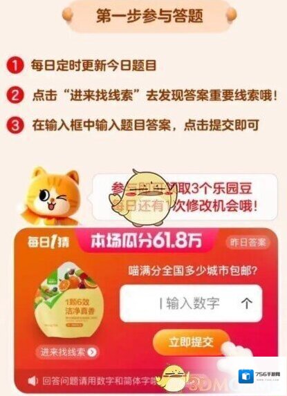3、每天凌晨3点会公布当天的题目,在答题栏输入答案之后,点击提交即参加成功。