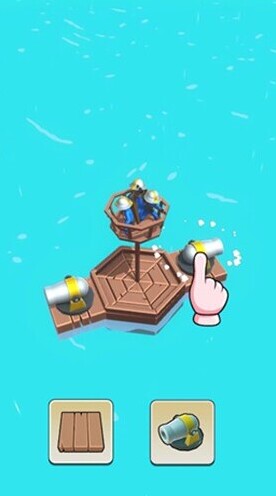 1、木筏生态建造:点击拖拽材料完成木筏扩建,木板搭建平台、树叶制作遮阳棚、绳索加固框架,根据航行需求设计“垂钓区-储物舱-武器台”的功能分区。