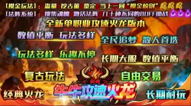 牛牛攻速火龙,185火龙单职业版本,充值货币可打,装备材料全爆,让你的每一份付出都会有收获!玩法丰富多样,包括全新特色的法阵系统等你体验,搜集魂魄,激活法阵,几十种不同的BUFF助战,带给你前所未有的激情体验!游戏内一切的装备、材料和货币皆可打,更有众多精彩福利活动可以体验,还有大量奖励免费白嫖,人人都有机会追梦,散人亦可逆袭!