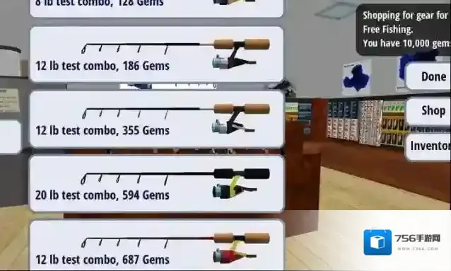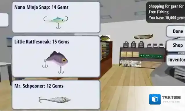 3、选好地点后需要去购买装备,点击shop按钮来购买不同的钓鱼装备。