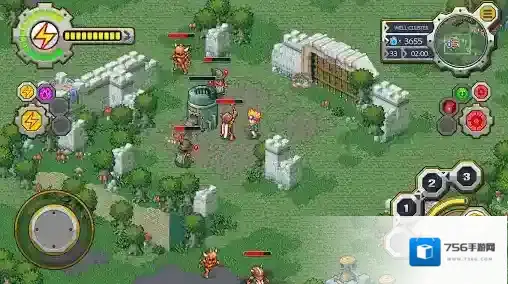6、当放好建筑后点击左上角的红色按钮可以开始战斗,你可以操控角色亲自上阵或者看着炮塔消灭你的敌人。