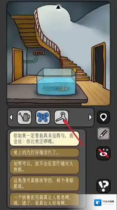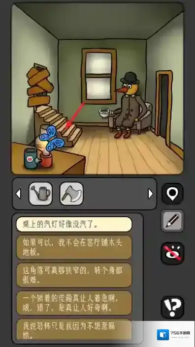 1、首先,当我们踏入房子内部后,径直前往二楼,在二楼的地面上找到并点击水壶。