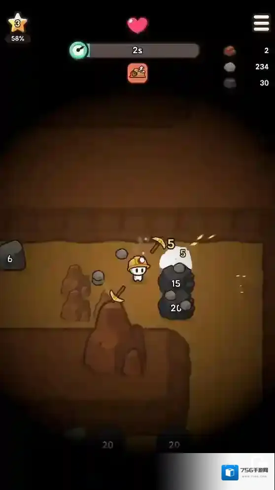 2、进入矿洞后角色周围会有一个转动的镐子,靠近矿物就可以造成伤害,击碎矿石后就可以收获不同的矿物。