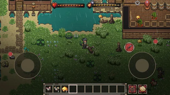 2、左边摇杆控制移动,右边按钮是攻击 / 互动 / 跳跃,右下角是背包、合成、技能面板。